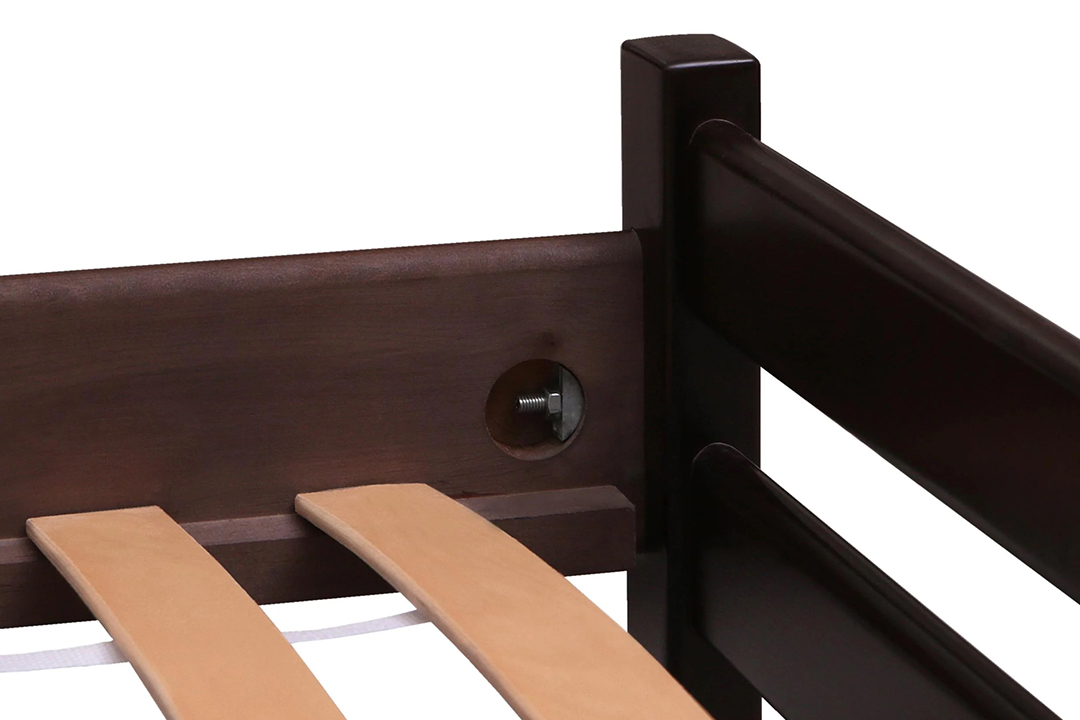 Ліжко виготовлене з натурального масиву сосни, що гарантує його надійність і довговічність. Екологічно чистий матеріал забезпечує безпеку та комфорт, створюючи ідеальні умови для повноцінного відпочинку.